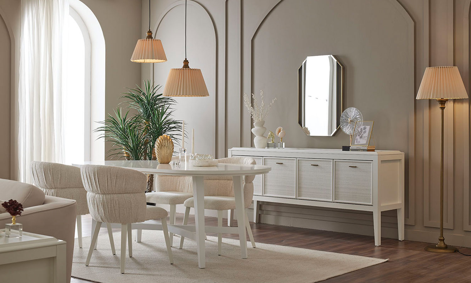 Olimpia Dining Room, which stands out with its white linen patterned design, features elegant metal handles and special profile details, interpreting the country style with a modern touch. It adapts to every space with different table and chair alternatives, while completing the functionality with the console mirror and hinge system with decelerator that reflects its style.