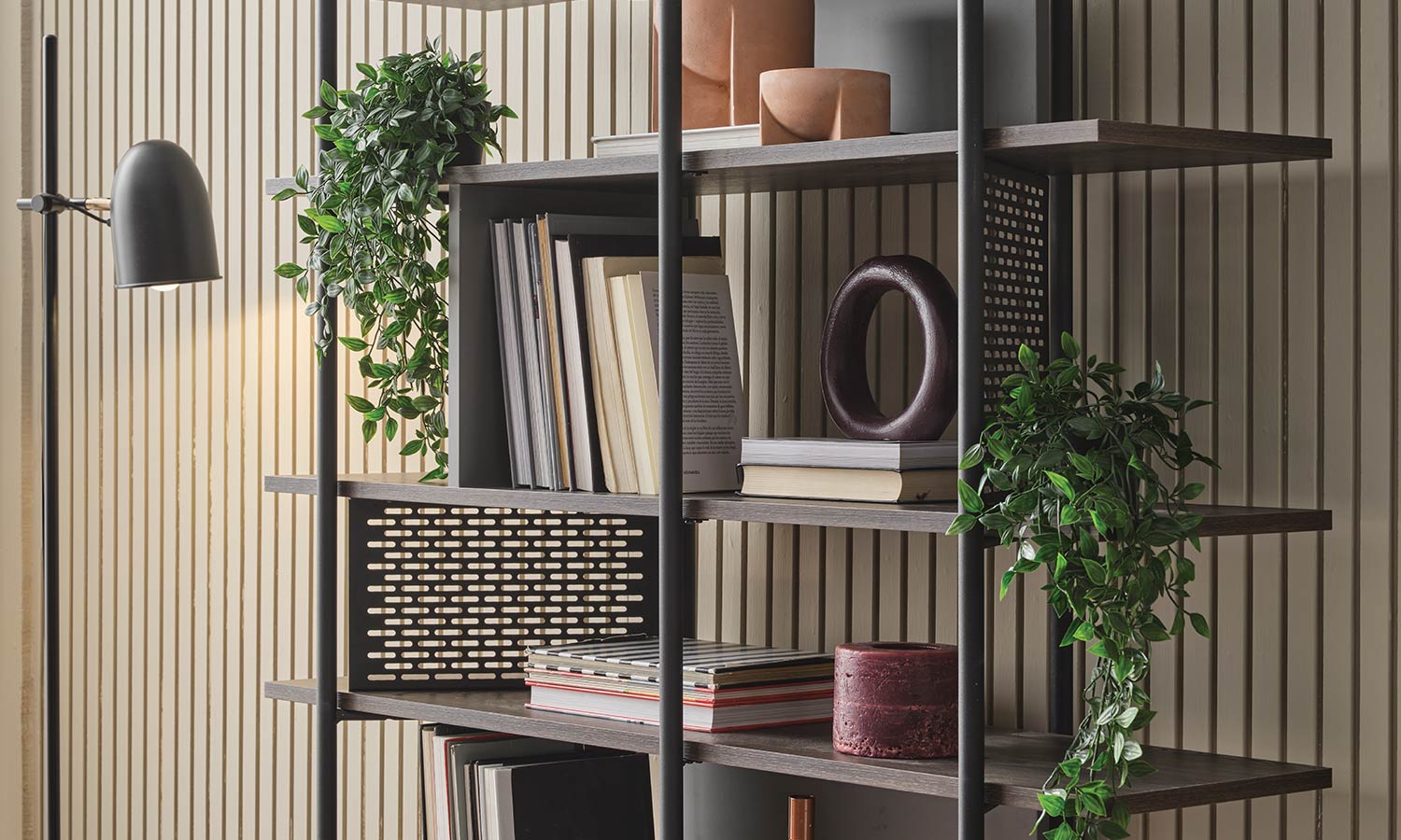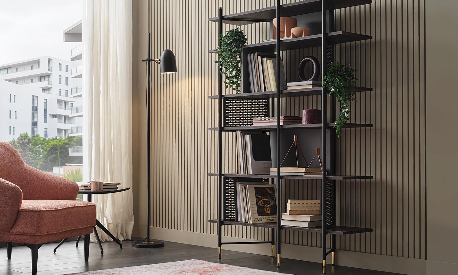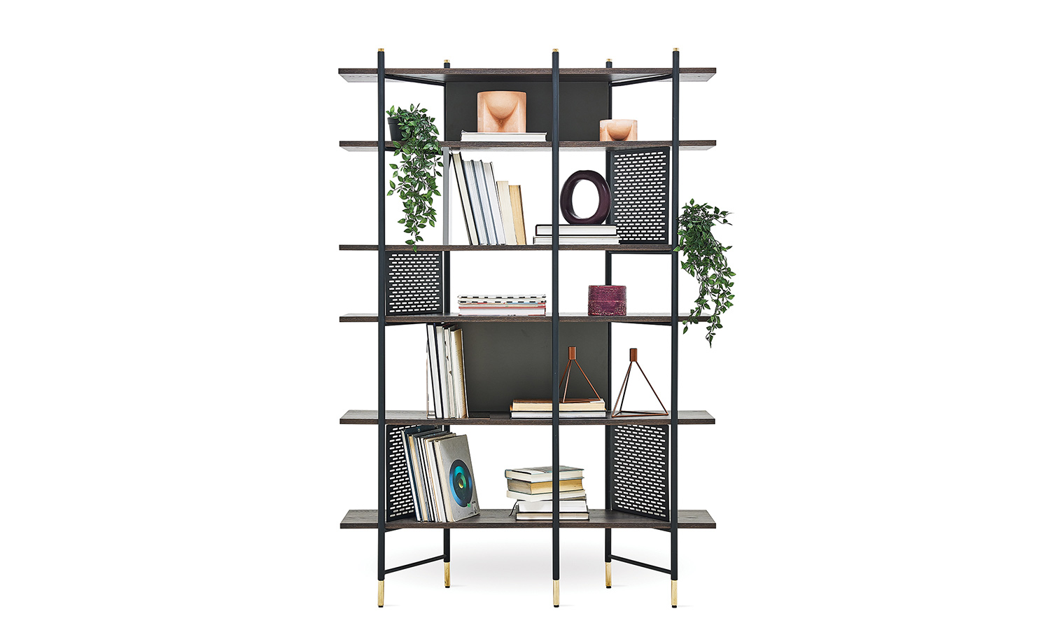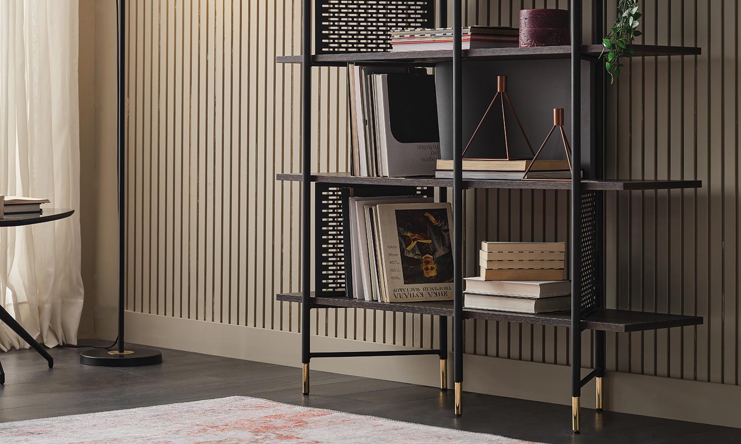 Dark Bookcase adds a unique character to spaces with its modern lines, aesthetic design and functionality. The custom-cut perforated and twisted decorative metal partitions allow you to store your books as well as display many decorative items such as flower pots, photo frames and ornaments. Dark Bookcase brings a new touch to the decoration of your living space with its golden color detailed leg design.