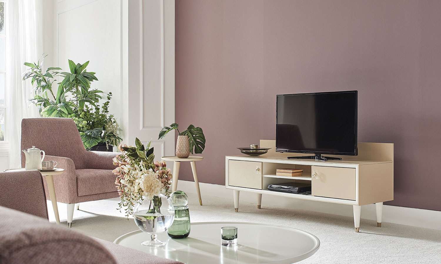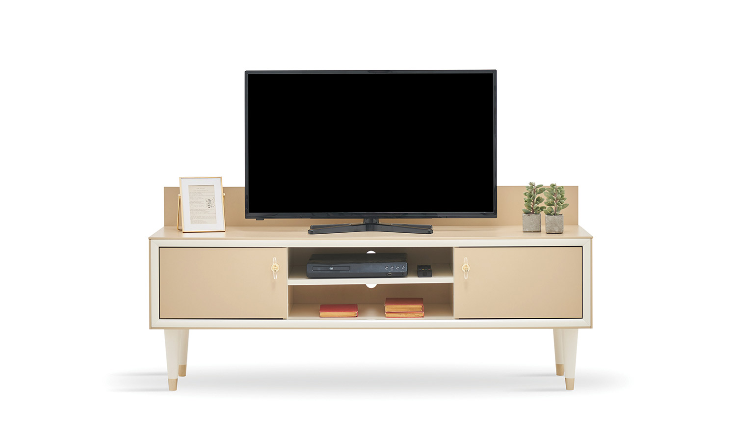 Romantic elegance meets convenient modules. Eva TV Unit fascinates with the elegance of caramel and pearl tones. The series, which stands out with its special design handles, is ideal for those who want to have a stylish and convenient lounge with 2 different size TV units with pearl profile application, elegant top cabinets with open racks.
