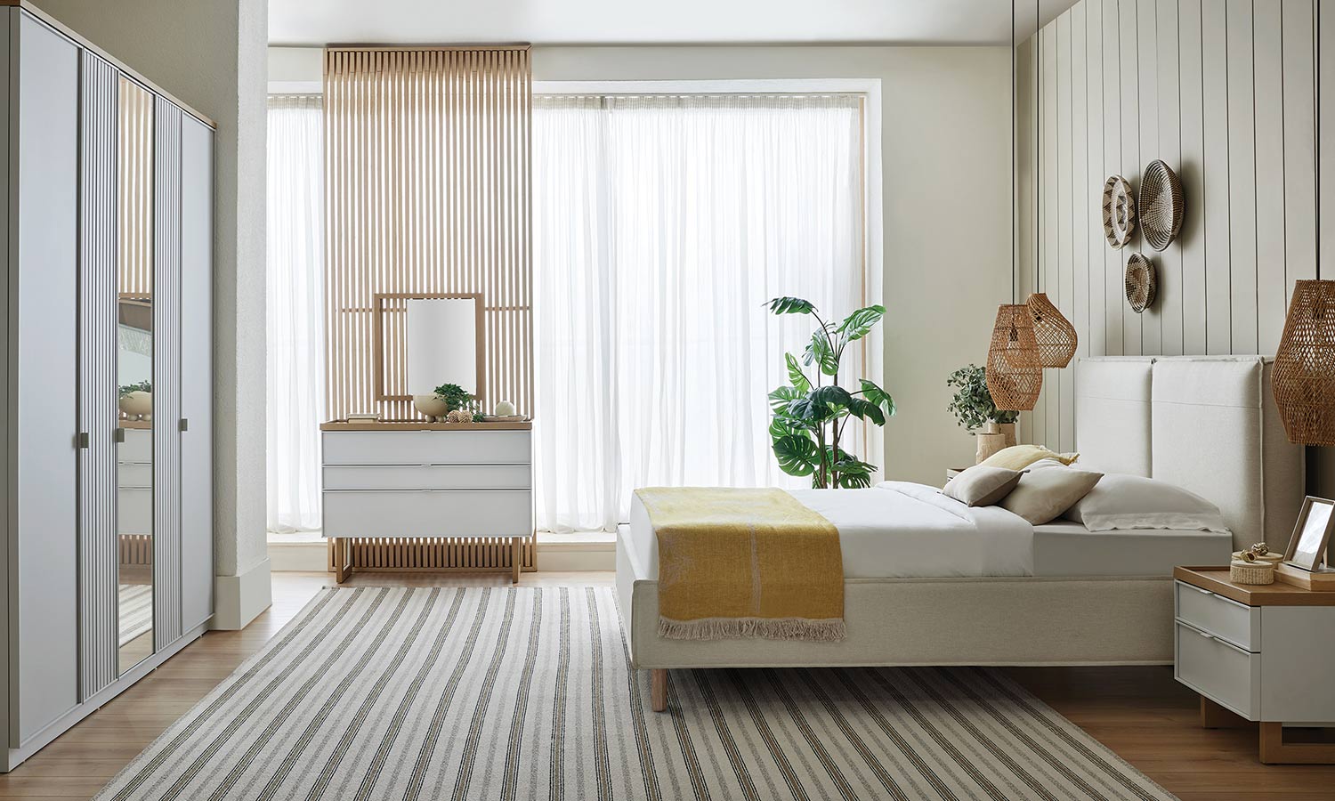 The Puerta Mosquito Net Set, bringing the Mediterranean style to your room, adds the finishing touch to your bedroom. It attracts attention as the most important complementary piece of the whole collection.