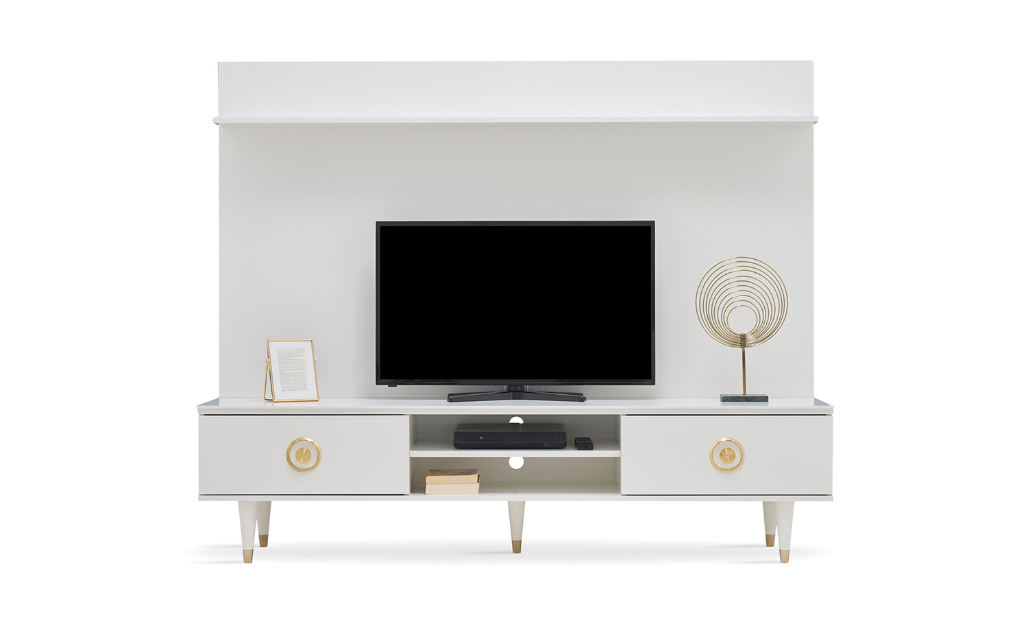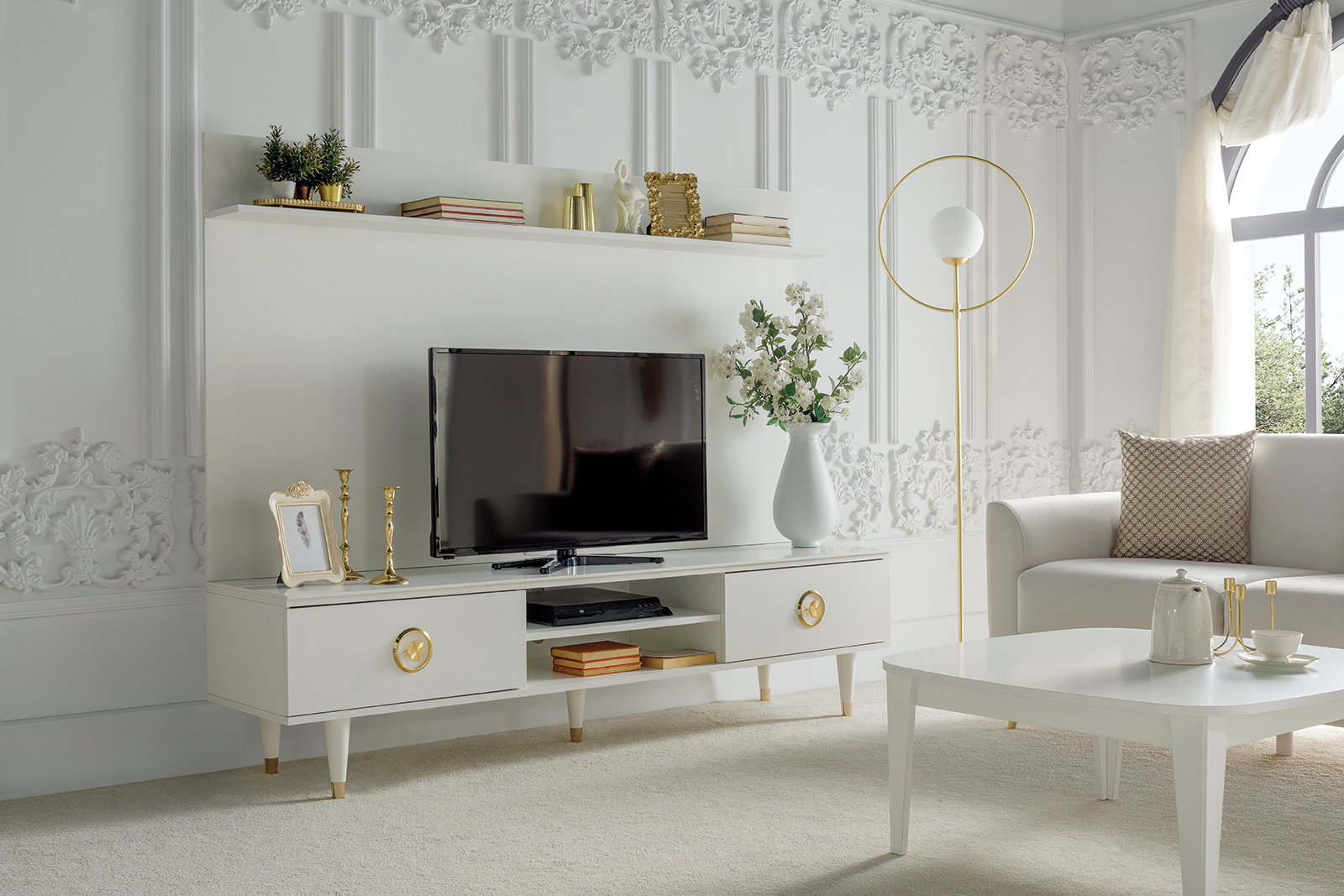 RomanaTV Unit's stylish white surfaces are one of the most beautiful examples of contemporary design. It stands out with its two different size TV unit alternatives and open racks that offer a convenient display space. Enriching its elegant look with a series-specific gold handle design, Romana TV Unit offers a subtle design taste.
