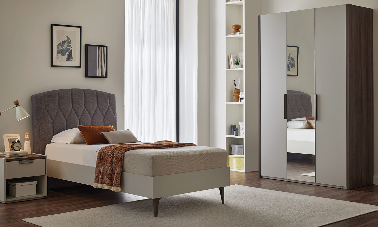 Morel Teen’s Room, which allows you to make the most of every space with its flexible module options, offers extra storage space thanks to its high chest of drawers. The desk and accompanying comfortable desk chair with a complementary upper module create a comfortable study environment. The Morel Teen’s Room with its special stitching details on the headboard, adding an elegant atmosphere, offers a silent and trouble-free usage experience with its soft-close hinge system.