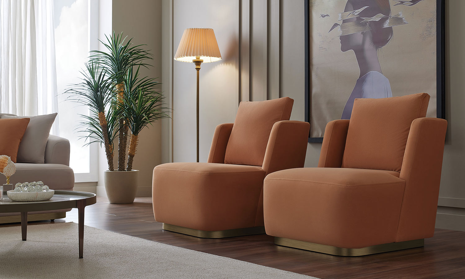 Keten ve kadife kumaş alternatifleri sunan Olimpia Bazalı Koltuk Takımı, yaşam alanlarında etkileyici bir dekorasyon oluşturuyor. Ceviz ve bronz tonlarında alternatif baza uygulaması, tasarıma hem sıcaklık hem de sofistike bir duruş kazandırıyor.