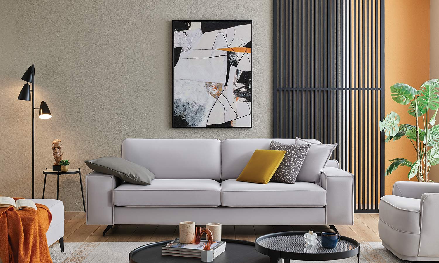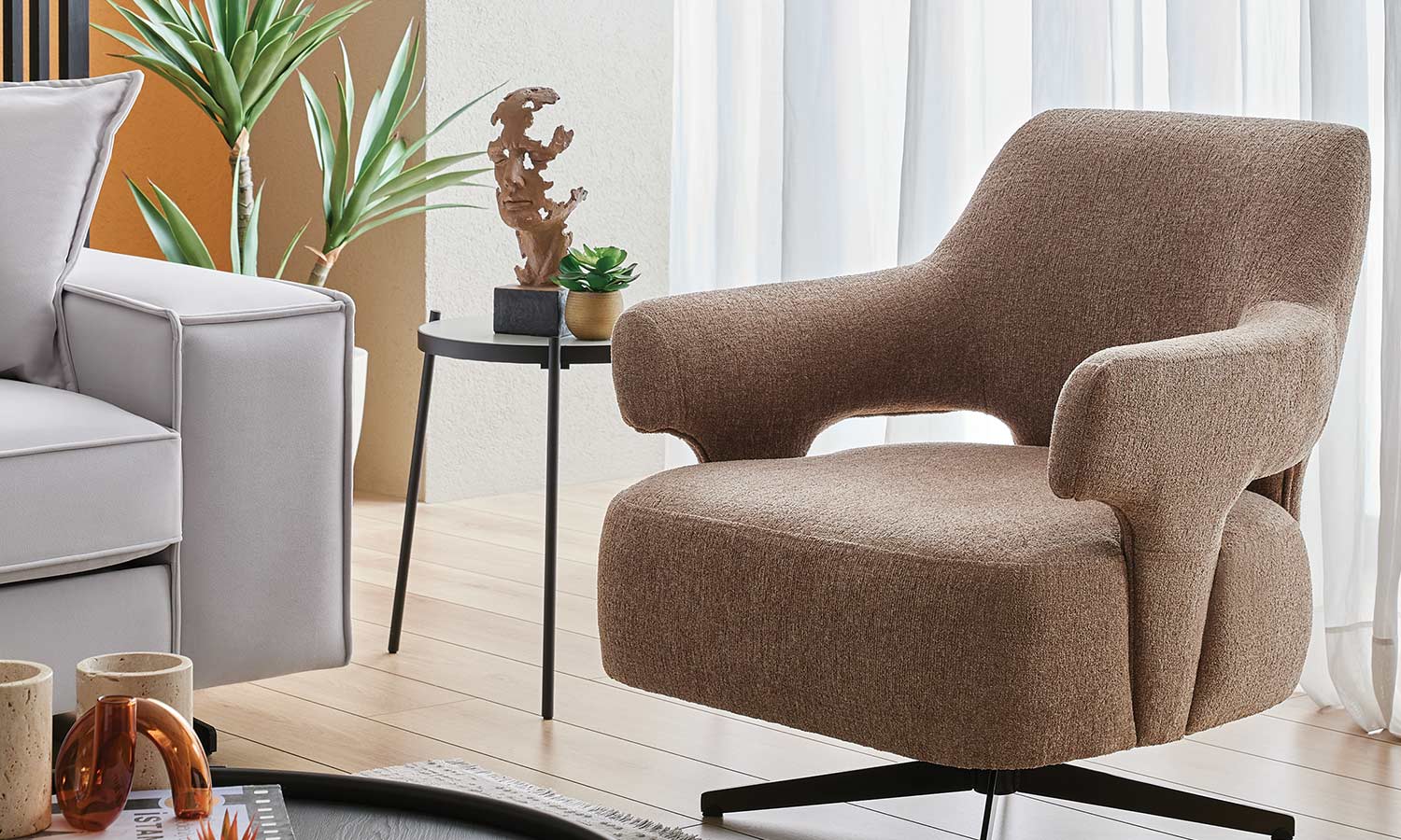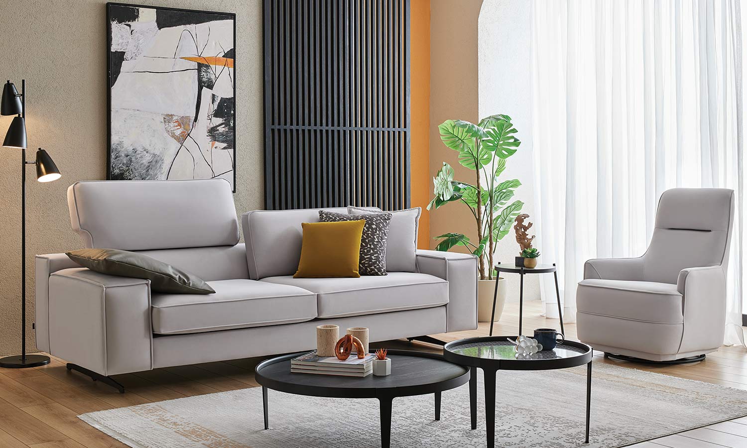 3’lü koltuğundaki yatak mekanizması, konuklarınız için yatak imkanı sunarken; farklı tasarımlı döner ayaklı berjer modülleri ile esnek kullanım imkanı sağlıyor. Modern TV koltuğu olarak tasarlanan yüksek sırtlı berjeri, rahat bir oturma deneyiminin yanında mekana estetik bir görünüm kazandırıyor. Koltuk ile birlikte uzanma modülü olarak da kullanılabilen salon pufu, dinlenme alanınızı yeniden tanımlıyor.