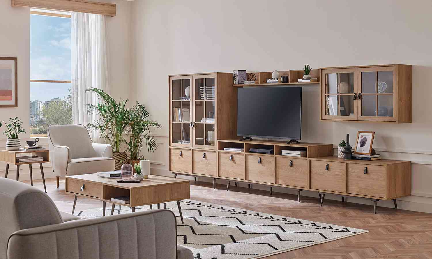 Modülerliğiyle her ihtiyaca uygun çözümler sunan Helis TV Ünitesi, geniş depolama alanı sağlıyor. Açık tonlardaki ahşap rengiyle evinizin havasını değiştirirken fonksiyonelliğiyle kullanışlılık sağlıyor. Cam raflarındaki ahşap görünümlü çıtalar ve çıtaların pencereli etkisi estetik bir görünüm sunuyor.