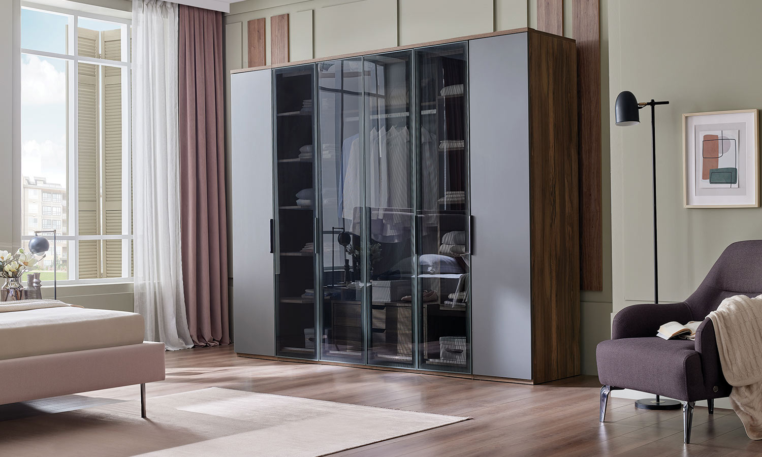 • 6 Kapaklı Akordeon dolapta çizgi desenli cam ve dolap içi çekmece uygulamaları, aydınlatma kullanımı