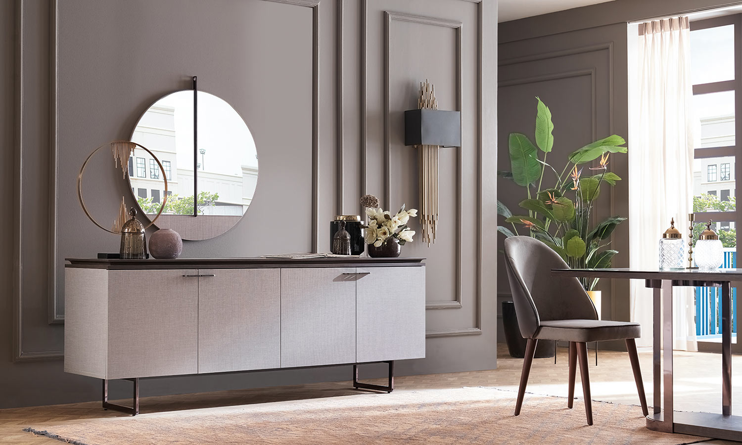 Şehirli, günümüz tasarım anlayışını takip eden Talin Serisi; özel formlu parçaları, farklı doku ve materyalleri bir araya getirmesiyle keyifli bir sofra deneyimi yaşatıyor. Keten görünümlü dokusuna eşlik eden minimal metal kulpları ve konsolunda yer alan ceviz tablasıyla şehrin çizgisini yansıtıyor. Metal ve ahşap ayak seçeneklerine sahip masa tasarımına uyumlu modern konsoluyla bir bütün oluşturuyor. Zamansız tasarımıyla Talin Yemek Odası ile keyifli davetler sizin olacak.