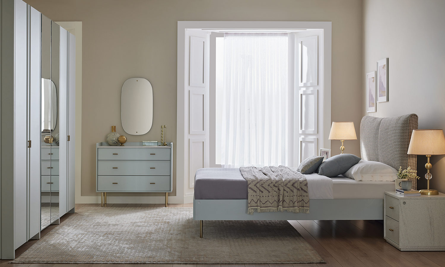 Yalın tasarım çizgileriyle Karlin Yatak Odası, pastel renklerin uyumunu yansıtıyor. Tasarımındaki gold detaylar ile dikkat çekiyor. Karyola kullanımının yanı sıra başlık ile uyumlu kazayağı desenli kumaş baza alternatifi ile depolama çözümü de sunuyor.