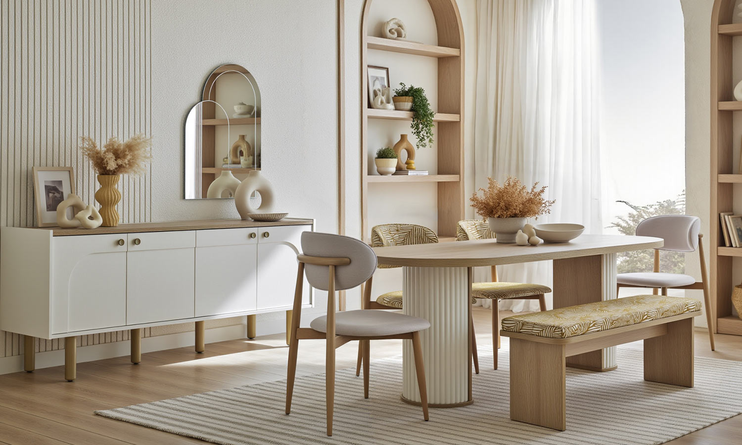 Kozy Yemek Odası, oval hatları ve kemer detaylarıyla hareket kazanırken, bej ve meşe dokulu yüzeyleriyle huzurlu bir ortam yaratıyor. Sandalye ve banklarda kullanılan floral desenli kumaşlar bohem stilin karakteristik çizgilerini modern bir yorumla evlerinize taşıyor. Konsol aynası hem işlevsel bir çözüm sağlıyor hem de alana derinlik kazandırıyor.