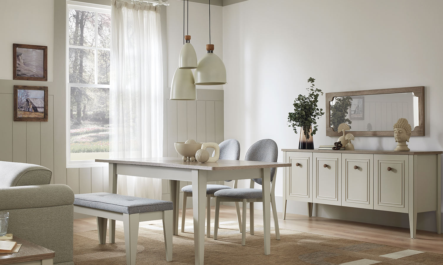 Yemek masası ve konsol üst tablalarında bulunan ahşap detayı ile salonunuza sadelik ve sıcaklık katan Rio Yemek Odası, koleksiyonu tamamlayan ayna modülü ile dekorasyonunuza country bir hava katıyor.