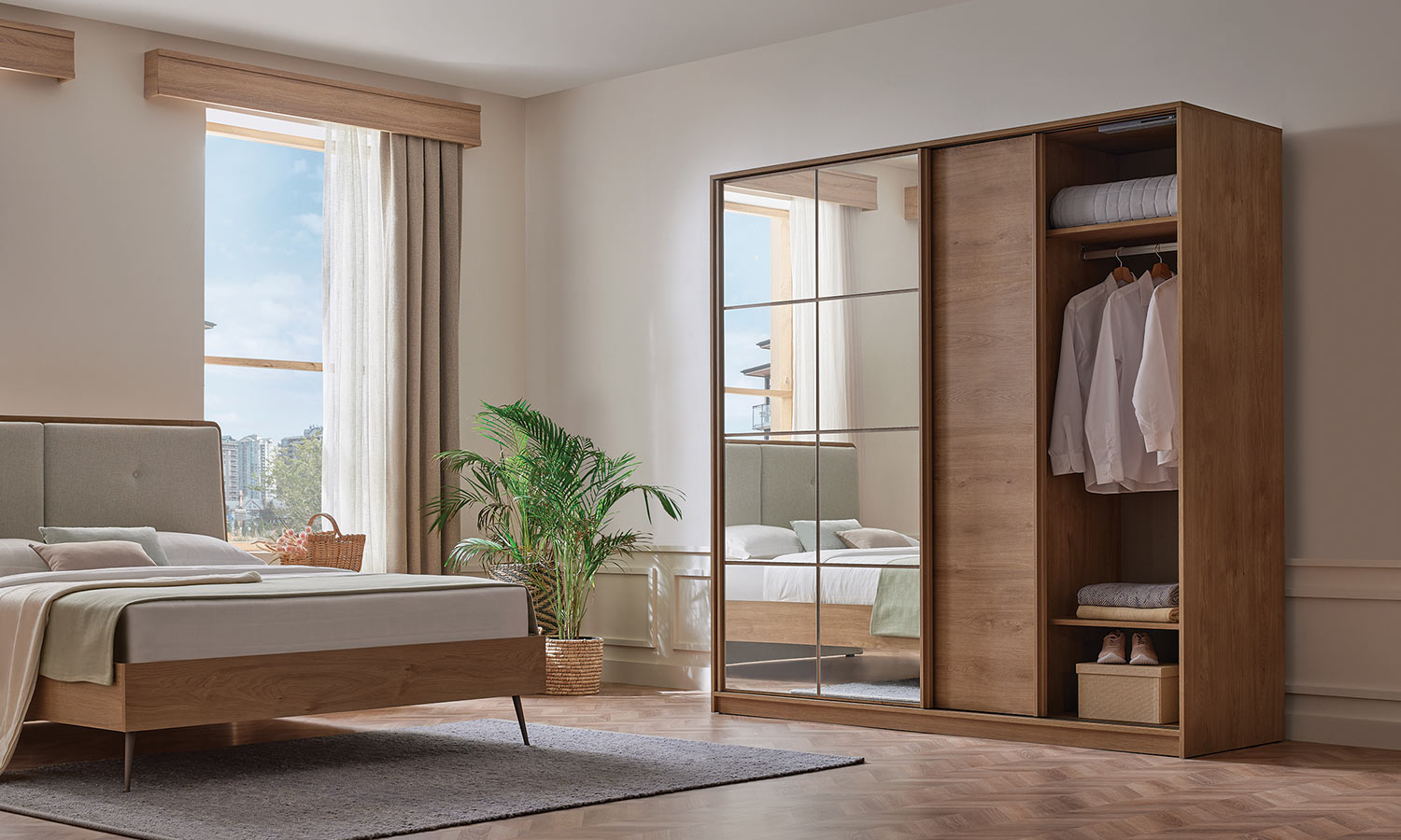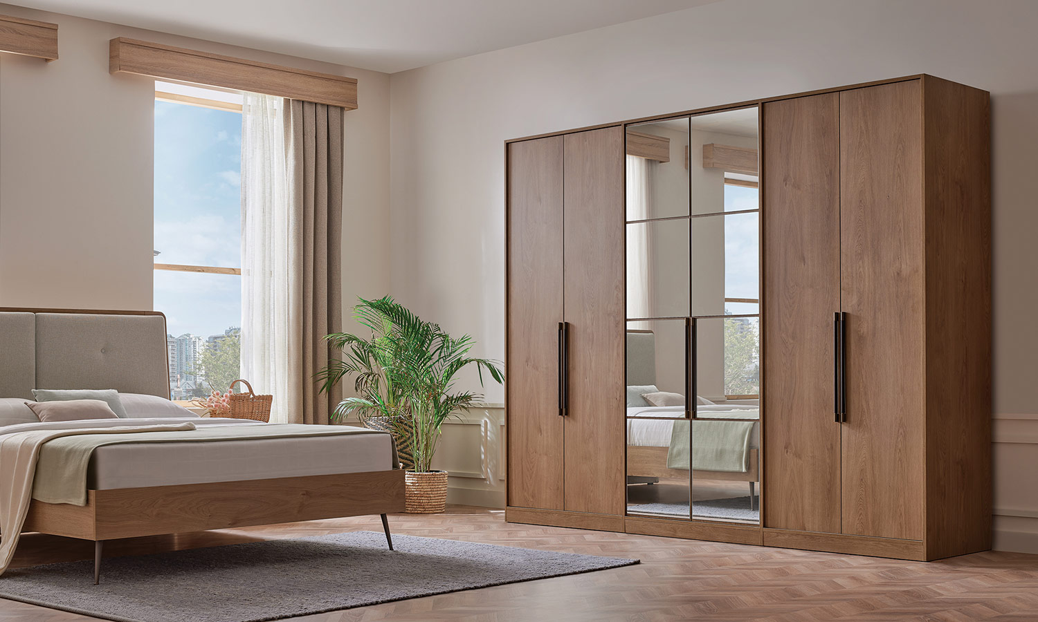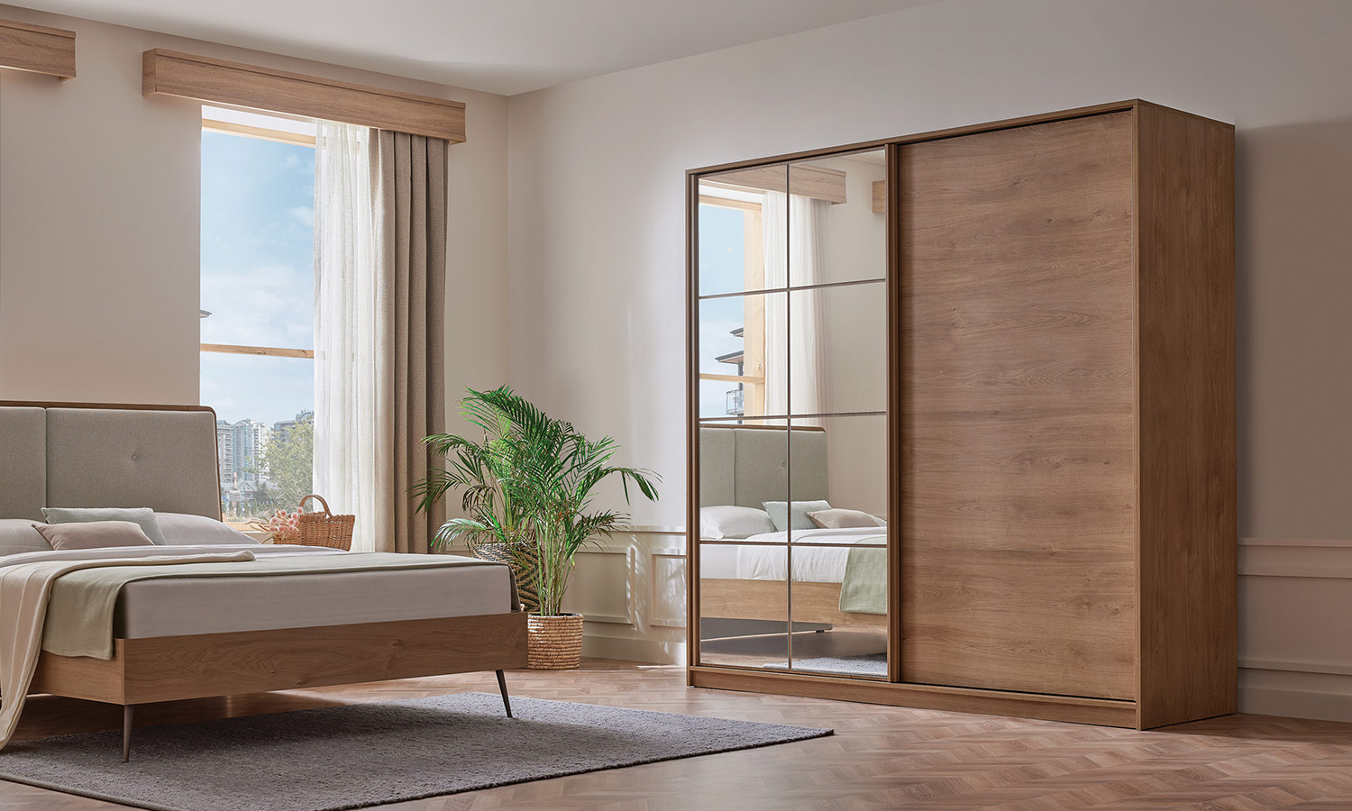 Helis Yatak Odası, bazalı ve metal karyolalı alternatifleriyle rahatınıza göre kullanım sunuyor. 5 ve 6 kapaklı dolabı ile sürgü kapaklı dolabının fonksiyonelliği, aynalı kapaklarındaki çıta kullanımıyla birleşiyor. Kahverengi deri kulp üzerinde beyaz dikiş ve eskitme bronz kaplama ise yatak odanızın güzelliğini tamamlıyor.