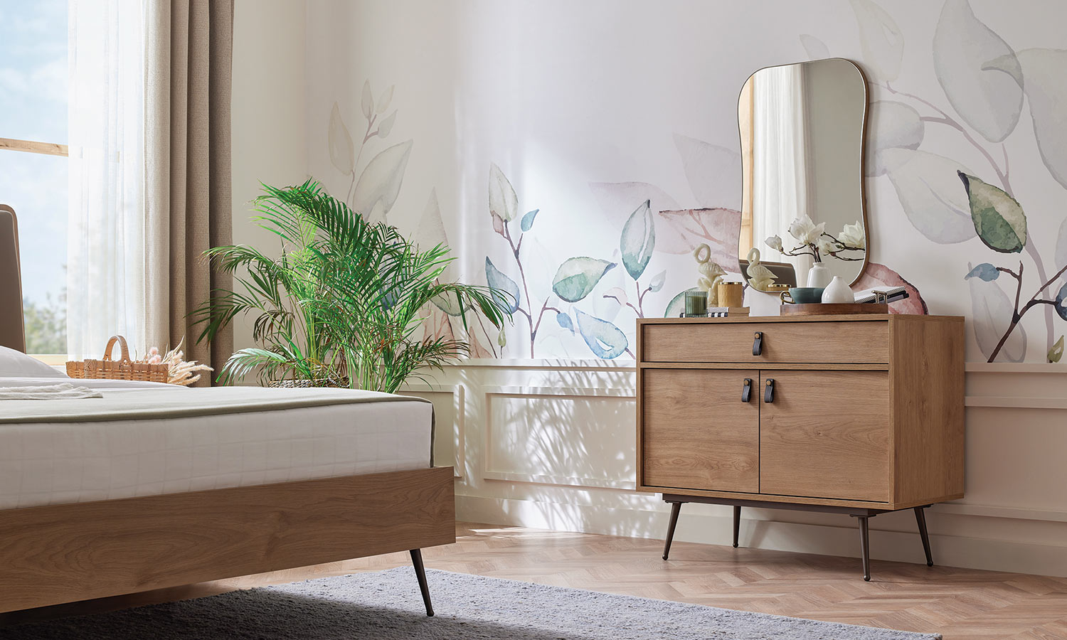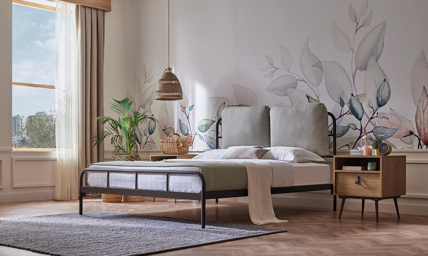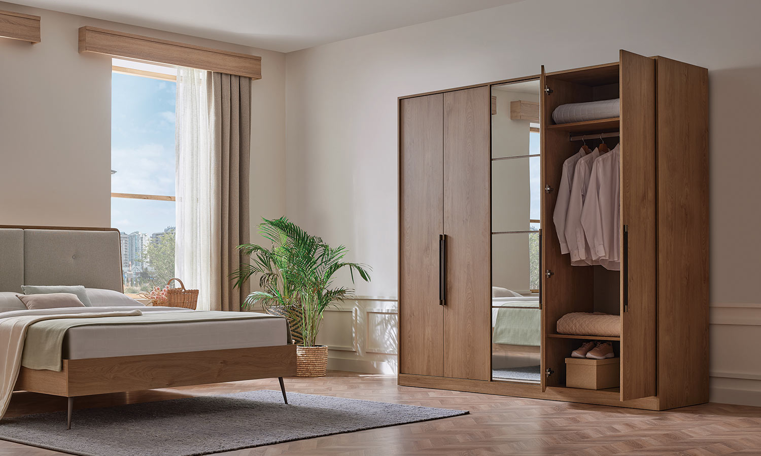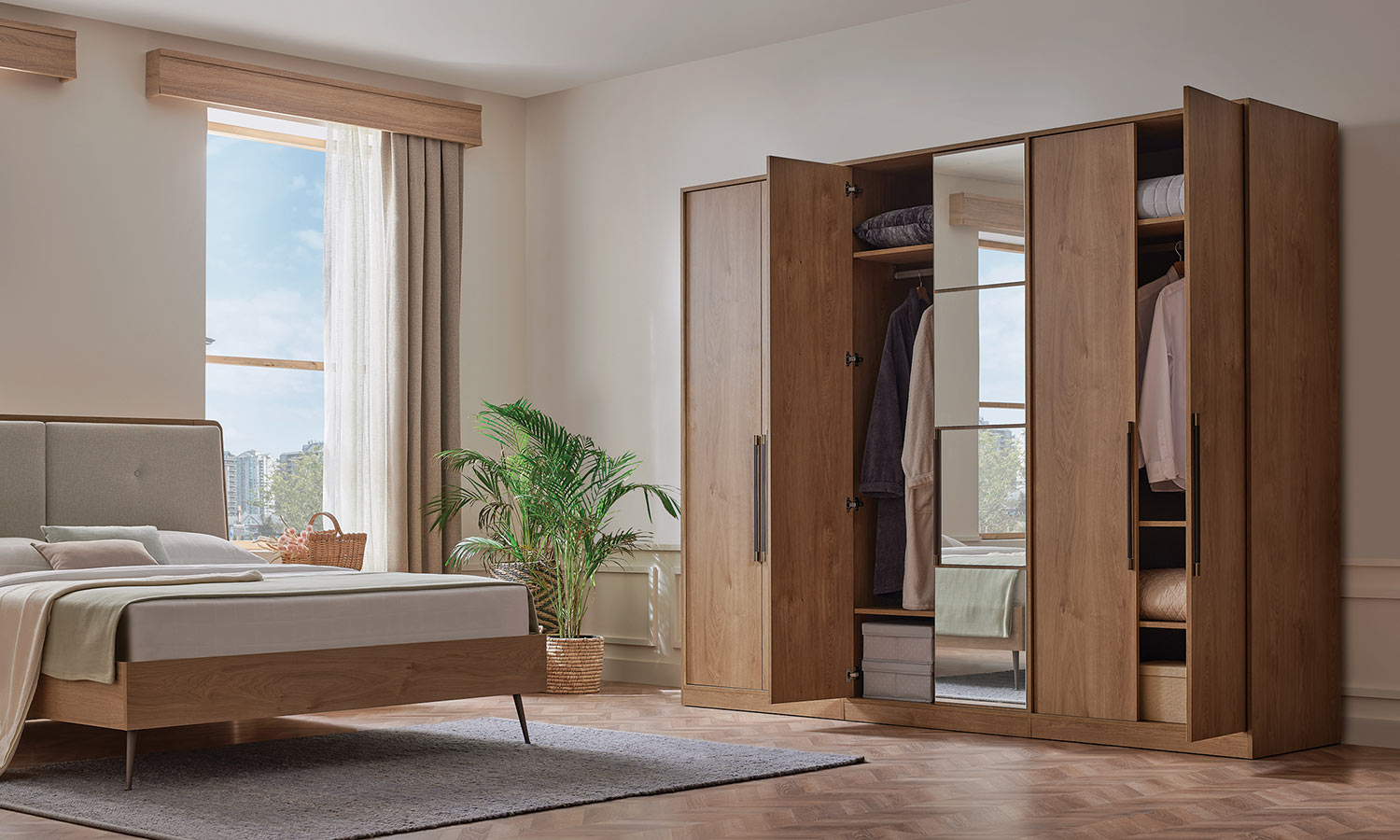 Helis Yatak Odası, bazalı ve metal karyolalı alternatifleriyle rahatınıza göre kullanım sunuyor. 5 ve 6 kapaklı dolabı ile sürgü kapaklı dolabının fonksiyonelliği, aynalı kapaklarındaki çıta kullanımıyla birleşiyor. Kahverengi deri kulp üzerinde beyaz dikiş ve eskitme bronz kaplama ise yatak odanızın güzelliğini tamamlıyor.