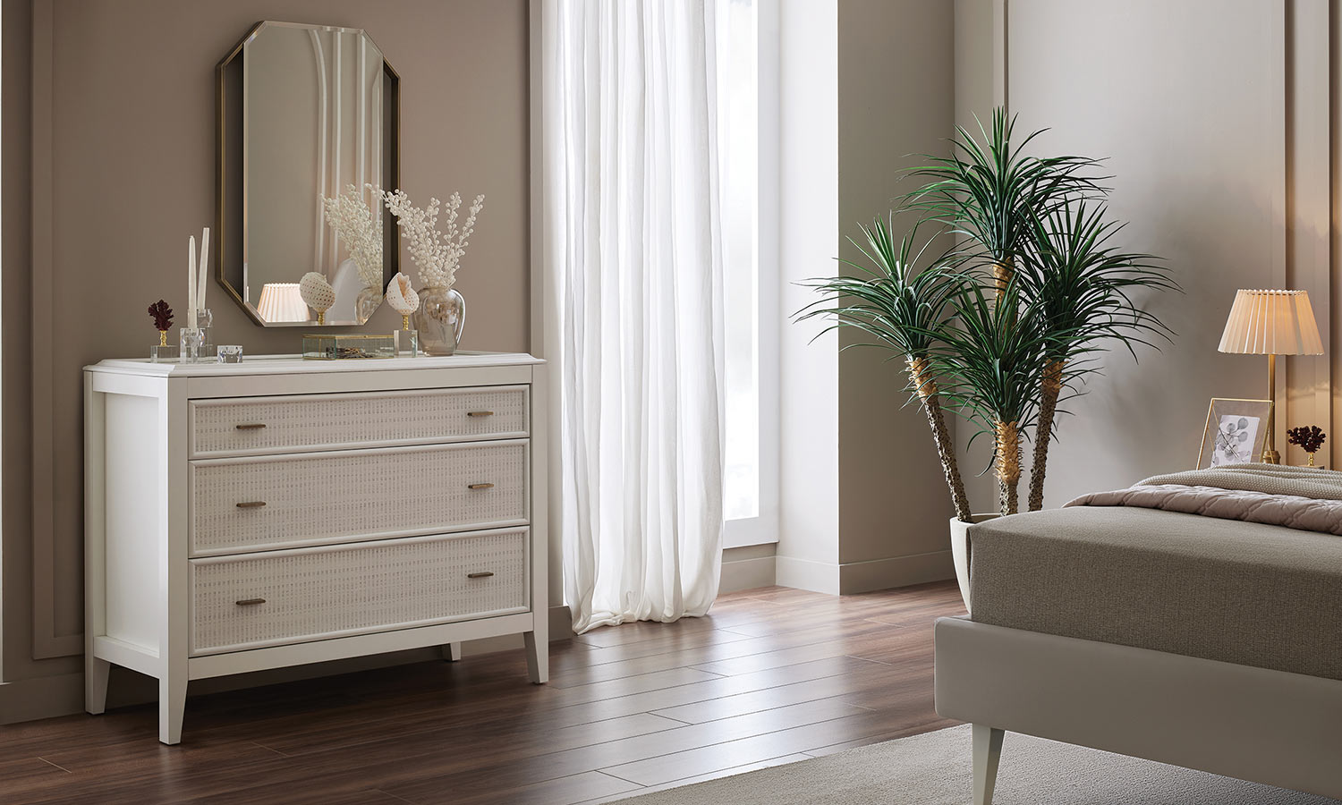 Zamansız bir şıklık sunan Olimpia Yatak Odası, keten desenli yüzeyleri, ince profil detayları ve yüksek ayak tasarımıyla huzurlu bir atmosfer yaratıyor. Farklı dolap alternatifleri, natürel ayna detayları ve fonksiyonel şifonyer tasarımıyla her ihtiyaca uyum sağlayarak konforu ve estetiği bir araya getiriyor.