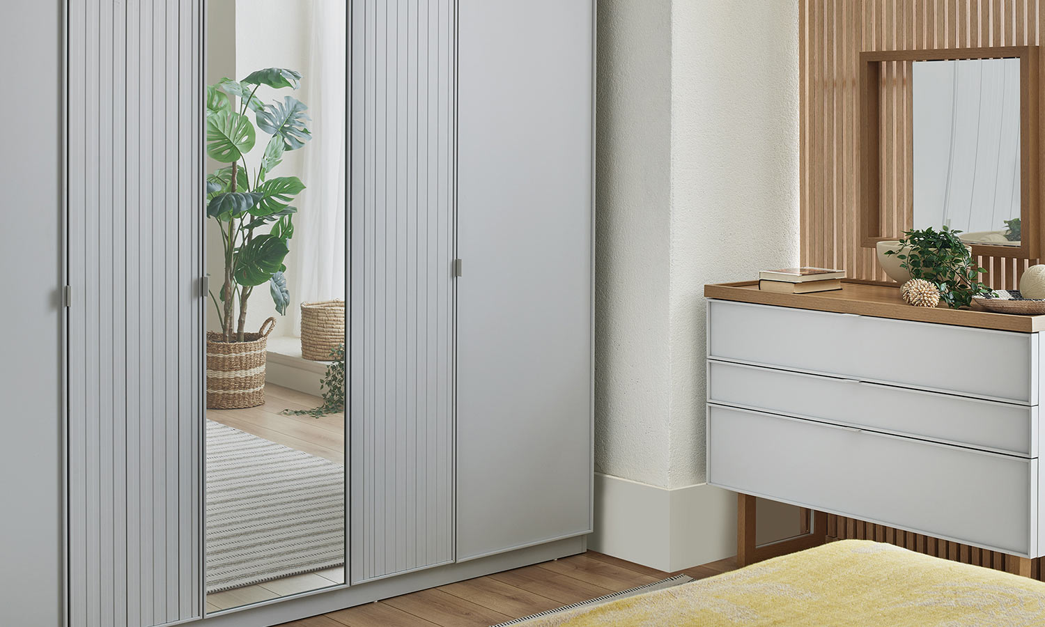 Akdeniz stilinin etkileyici görünümü şifonyer ve komodine derinlik katan ayrıntılarla ön plana çıkıyor. Farklı dolap kapak alternatifleri ihtiyacınıza uygun çözümler sunarken kapaklardaki ayna detayları odanıza ferah bir görünüm katıyor.