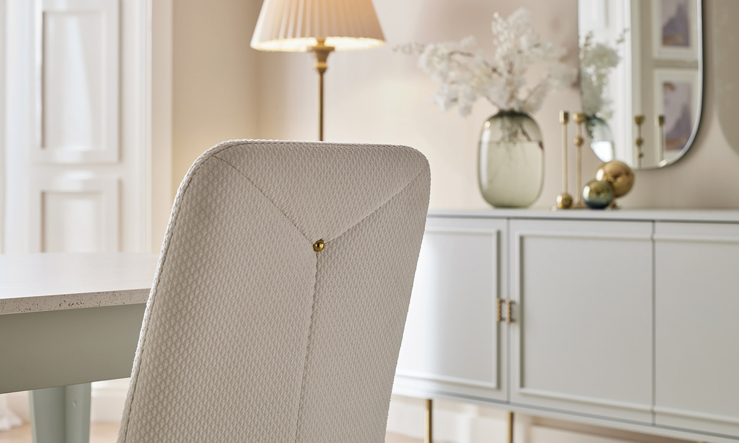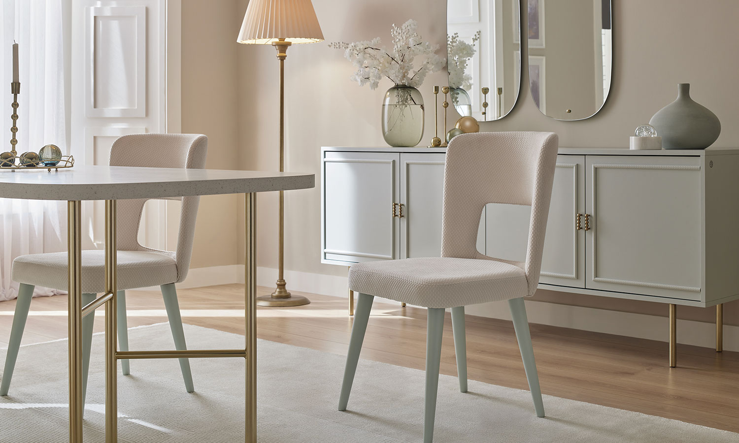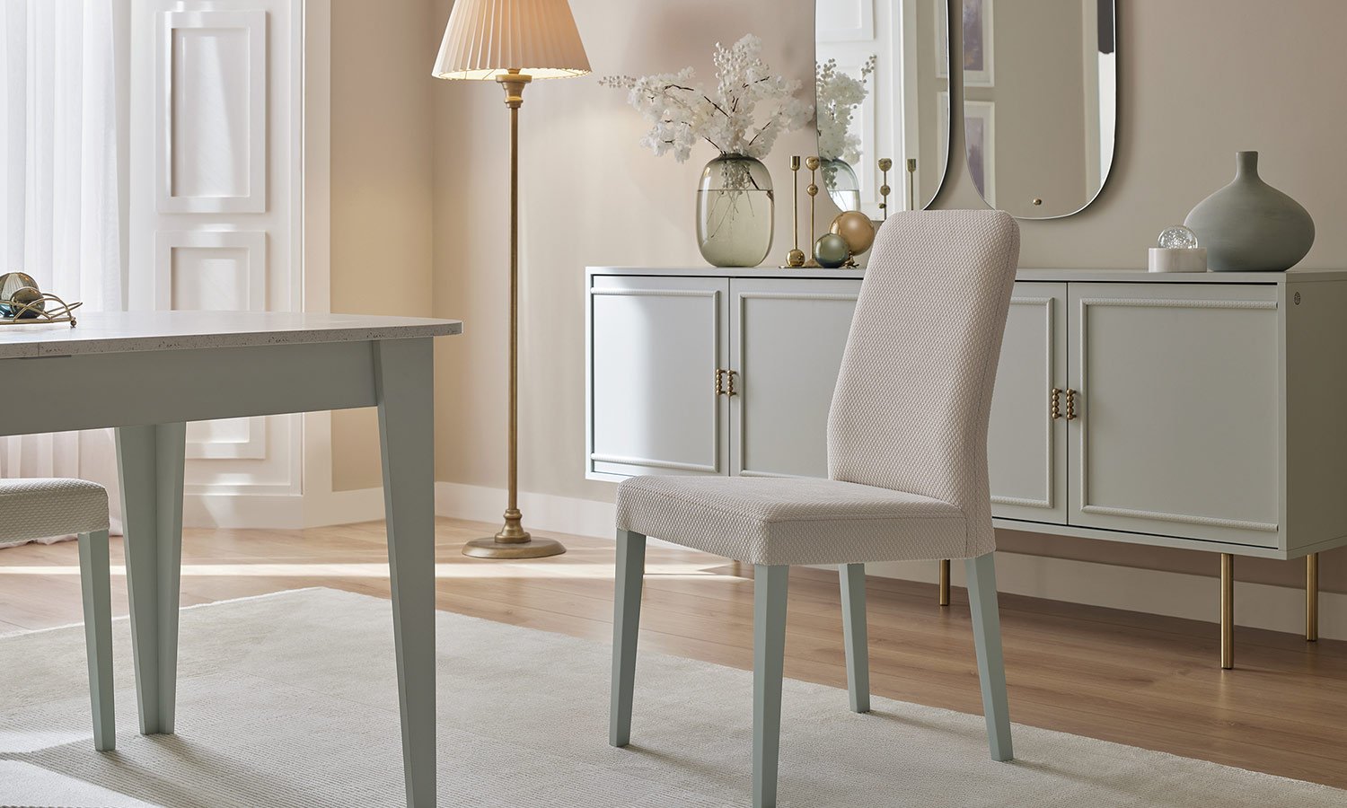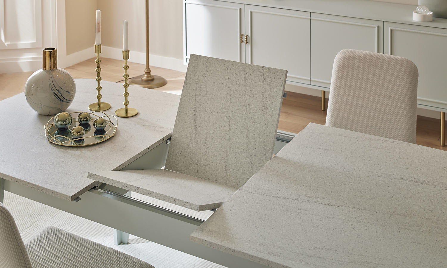 Zarif tasarım çizgilerine sahip Karlin Yemek Odası, pastel yeşil tonları, özel taş desen ve gold detayların kombinasyonuyla yaşam alanlarınıza değer katıyor. Açılır ve sabit masanın yanı sıra 3 farklı sandalye alternatifi ile farklı ihtiyaçlara uygun çözümler sunuyor.