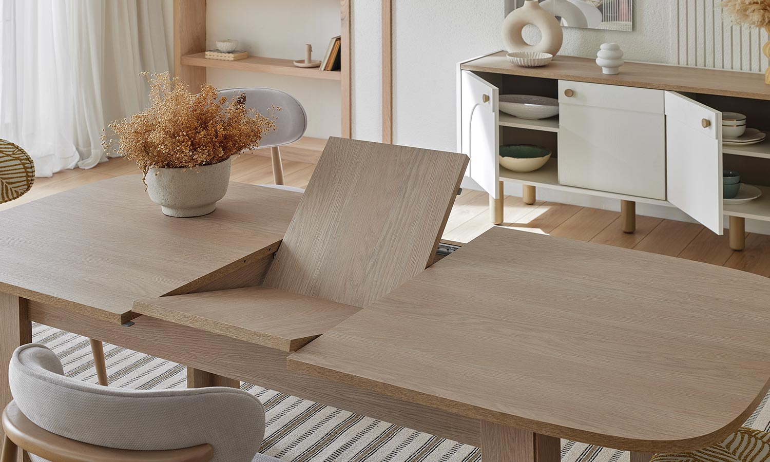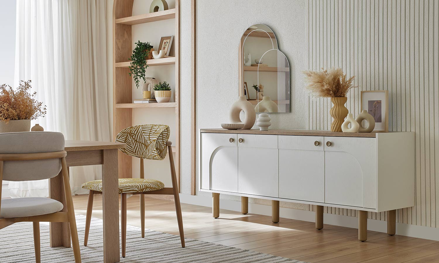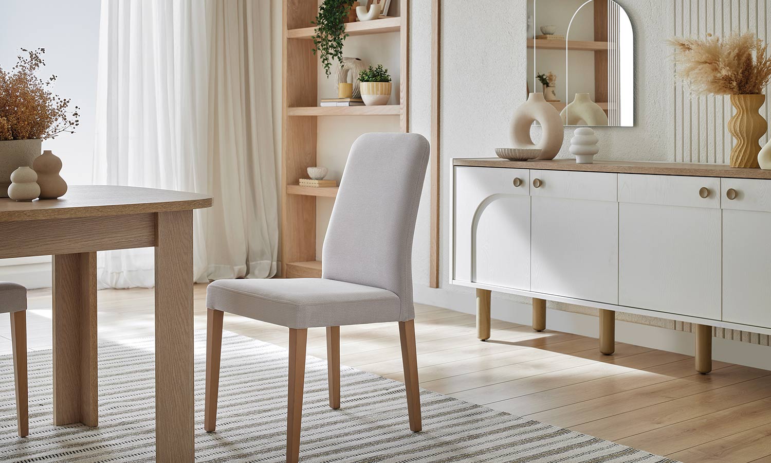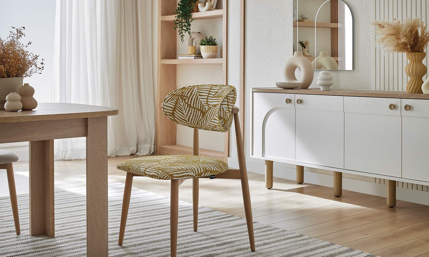 Kozy Yemek Odası, oval hatları ve kemer detaylarıyla hareket kazanırken, bej ve meşe dokulu yüzeyleriyle huzurlu bir ortam yaratıyor. Sandalye ve banklarda kullanılan floral desenli kumaşlar bohem stilin karakteristik çizgilerini modern bir yorumla evlerinize taşıyor. Konsol aynası hem işlevsel bir çözüm sağlıyor hem de alana derinlik kazandırıyor.
