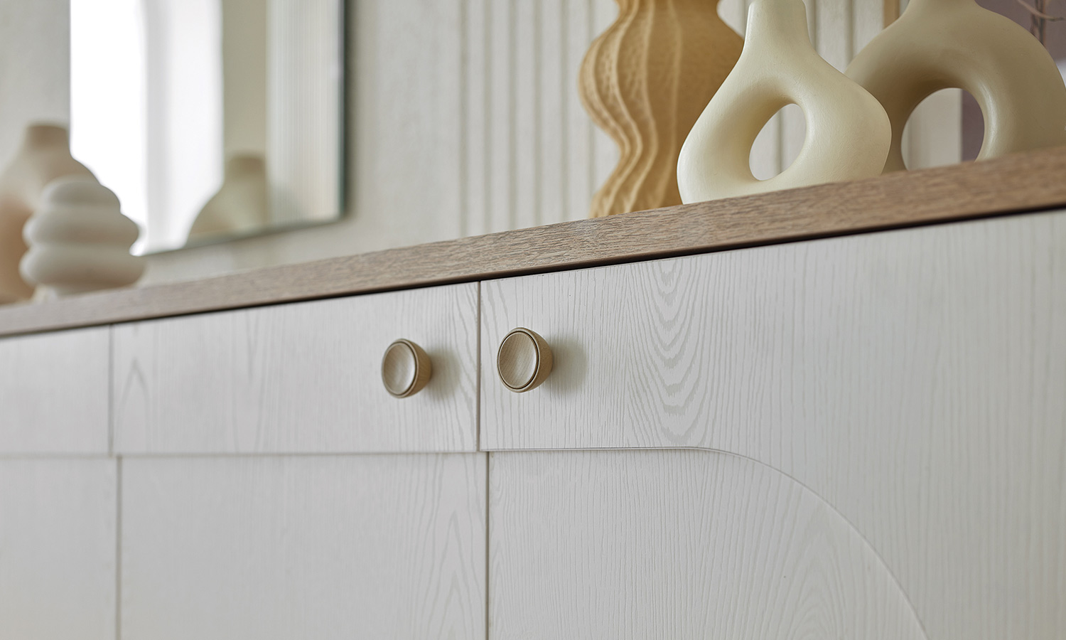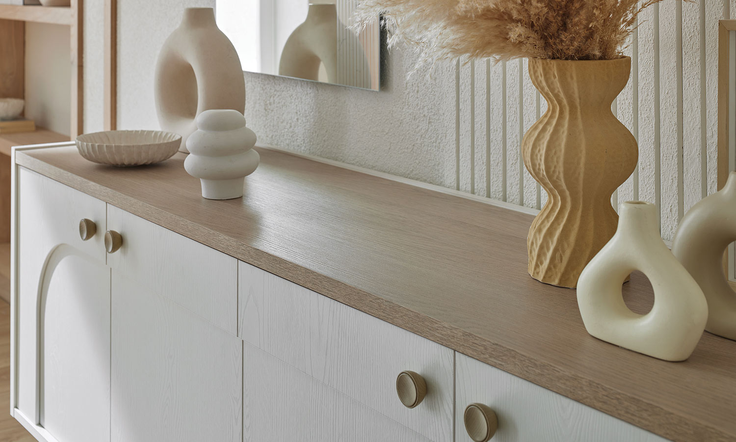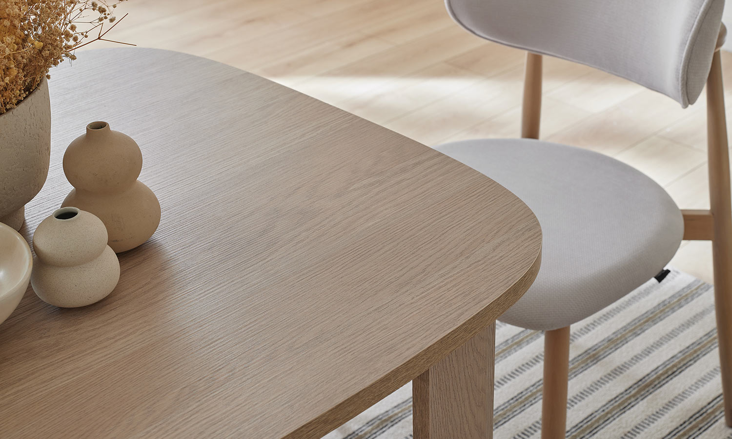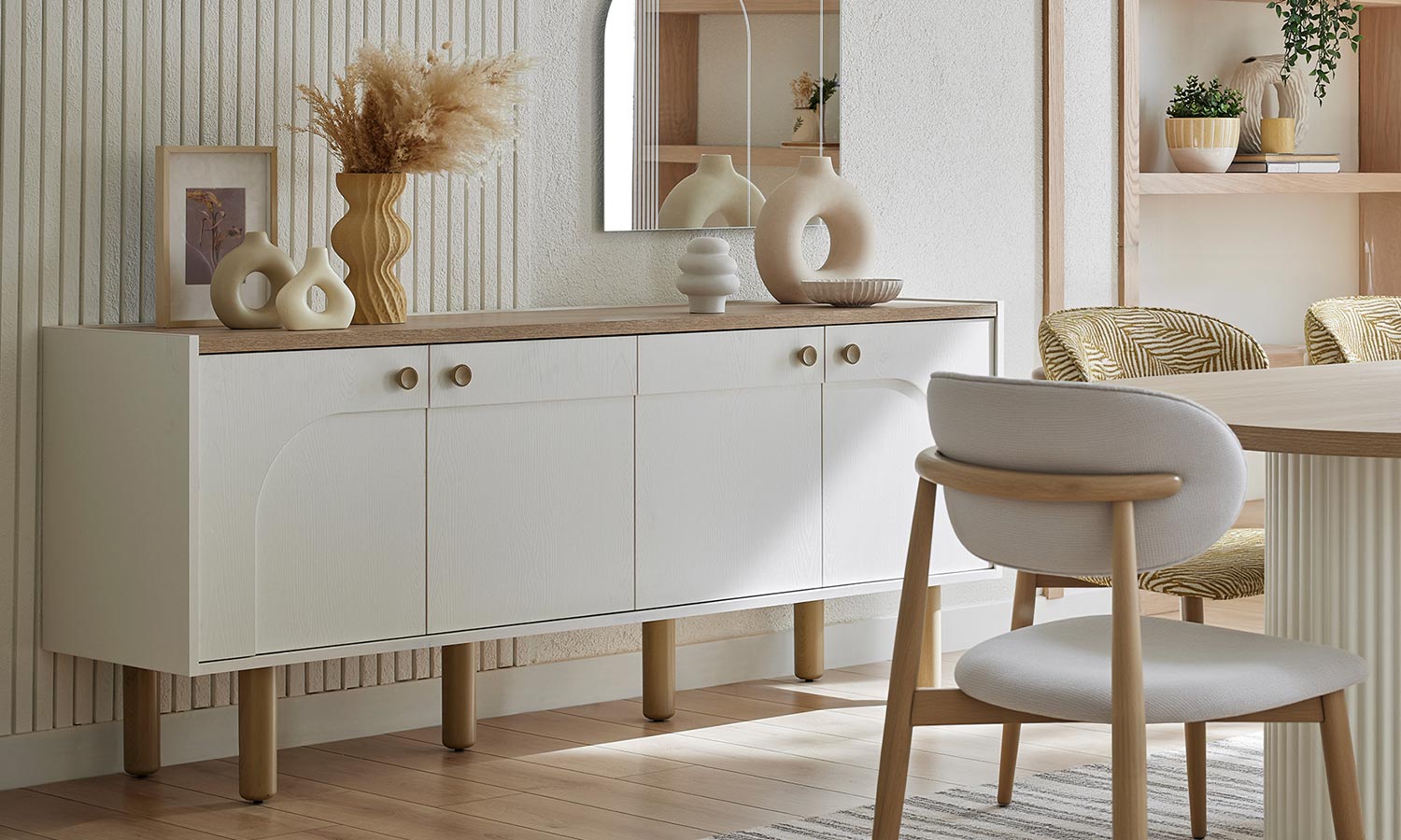 Kozy Yemek Odası, oval hatları ve kemer detaylarıyla hareket kazanırken, bej ve meşe dokulu yüzeyleriyle huzurlu bir ortam yaratıyor. Sandalye ve banklarda kullanılan floral desenli kumaşlar bohem stilin karakteristik çizgilerini modern bir yorumla evlerinize taşıyor. Konsol aynası hem işlevsel bir çözüm sağlıyor hem de alana derinlik kazandırıyor.