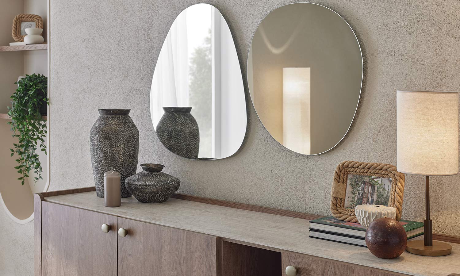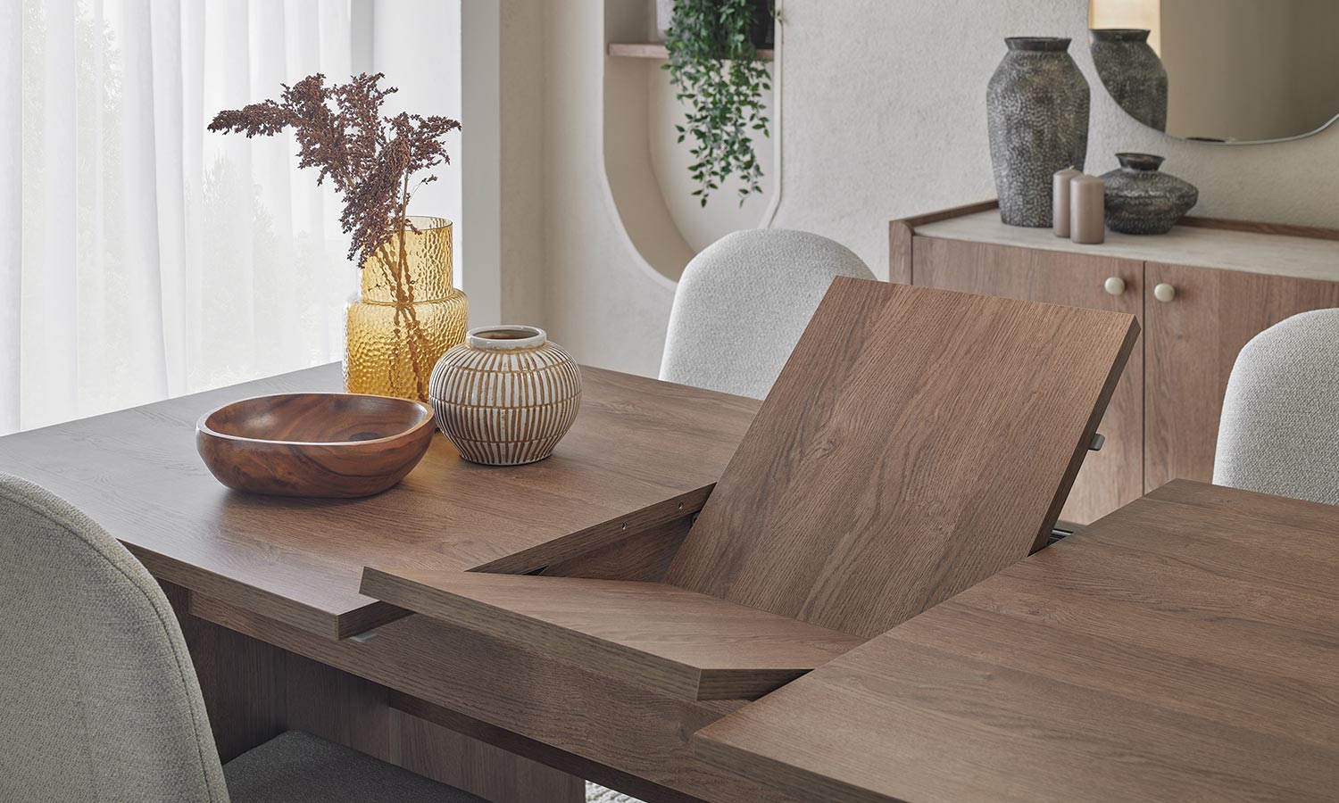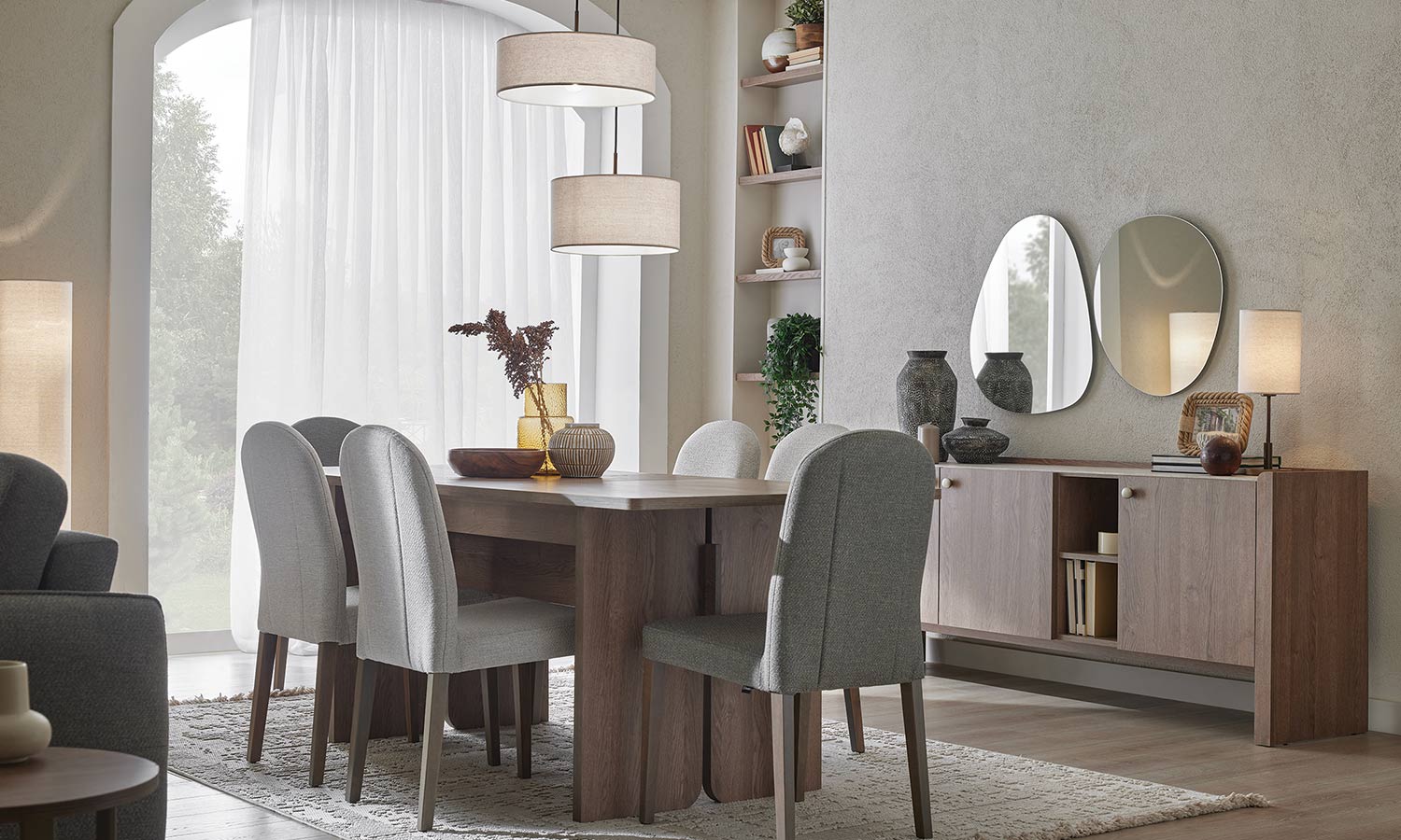 Fonksiyonel konsol tasarımı yalnızca depolama alanı sunmakla kalmıyor, havuzlu traverten üst tabla ile derinlik hissi oluşturuyor. Amorf formda dekoratif aynalar ise tasarımı tamamlayan zarif detaylardan biridir. Dört farklı masa alternatifi ve iki sandalye seçeneği her ihtiyaca hitap eden kombinasyonlara olanak tanıyor.