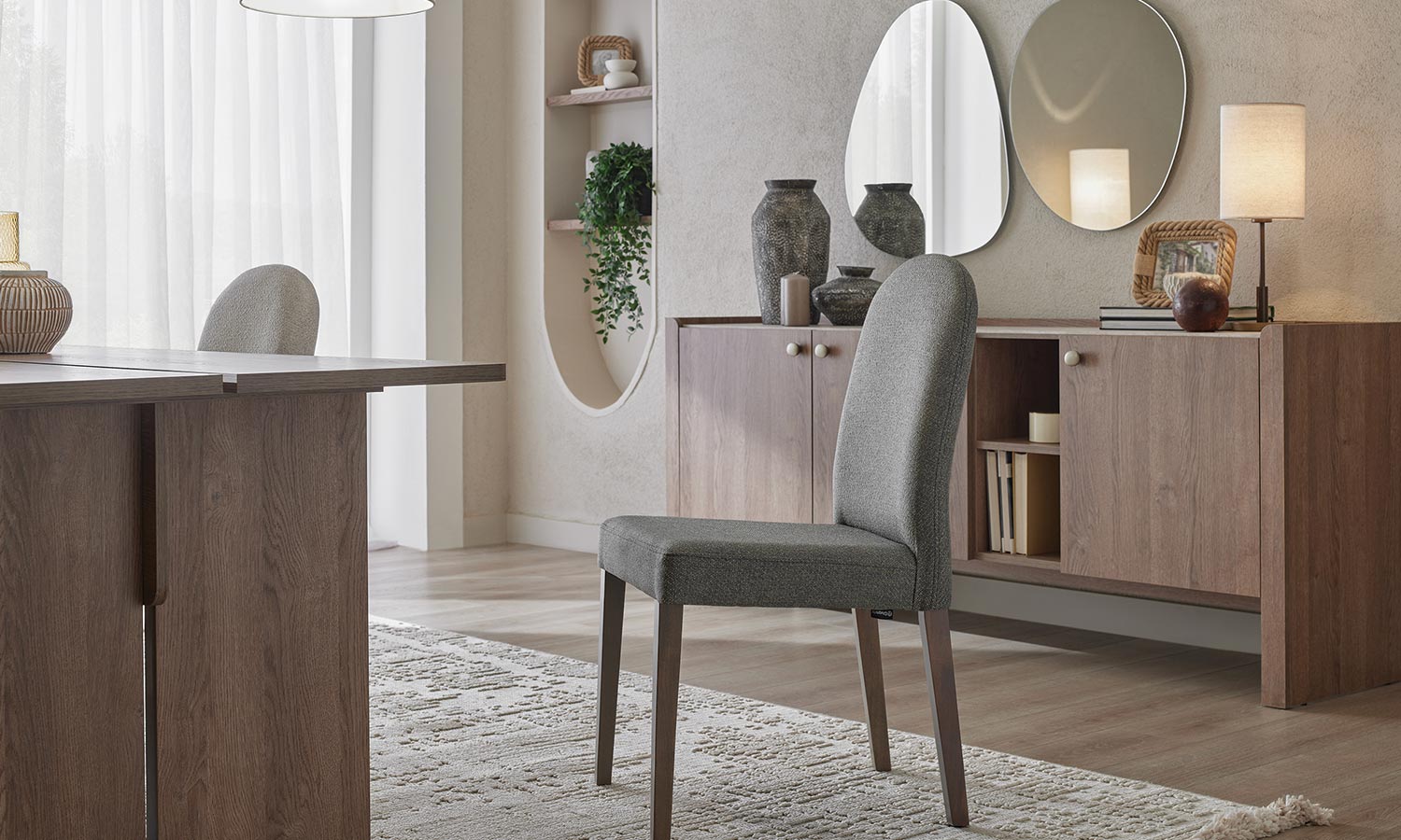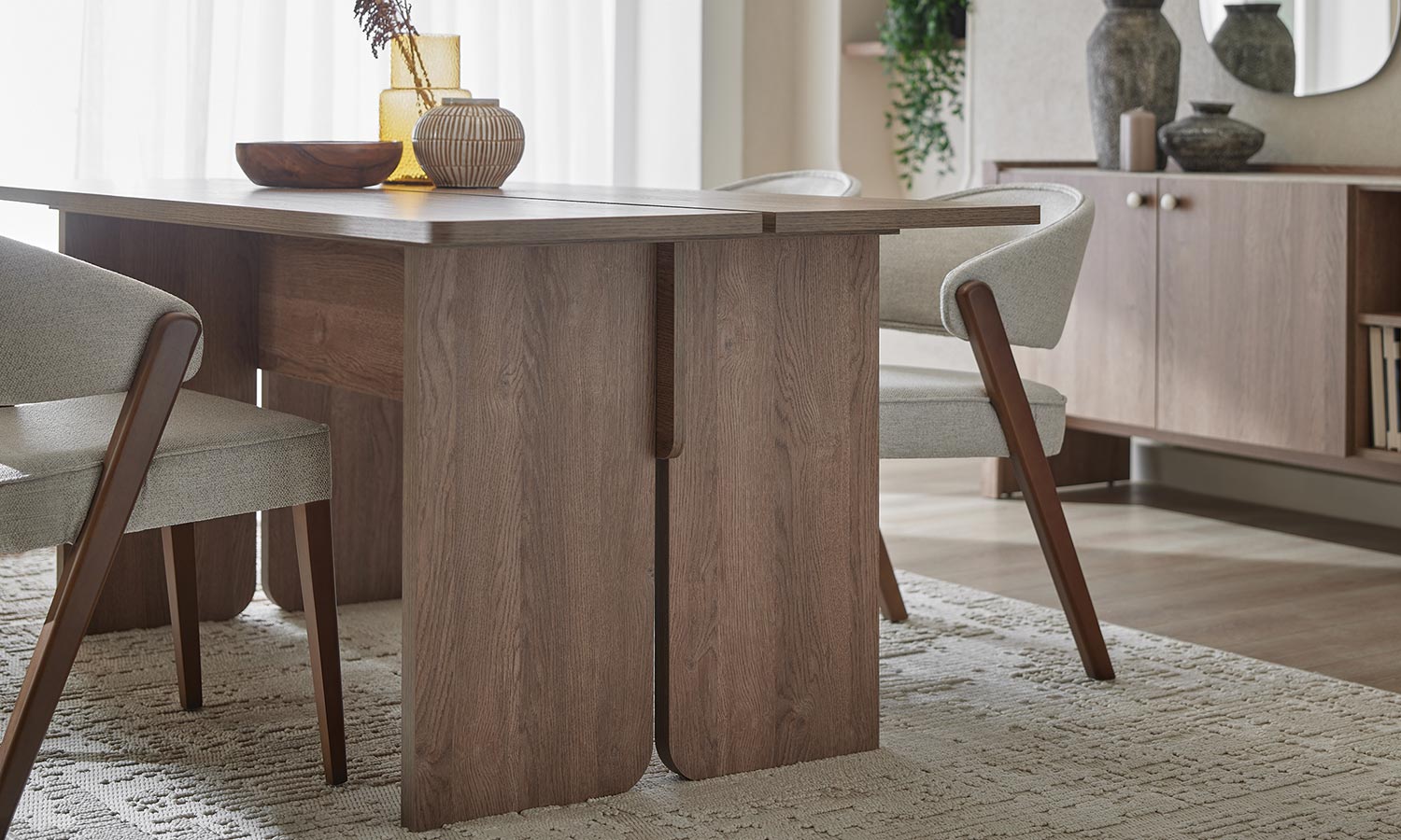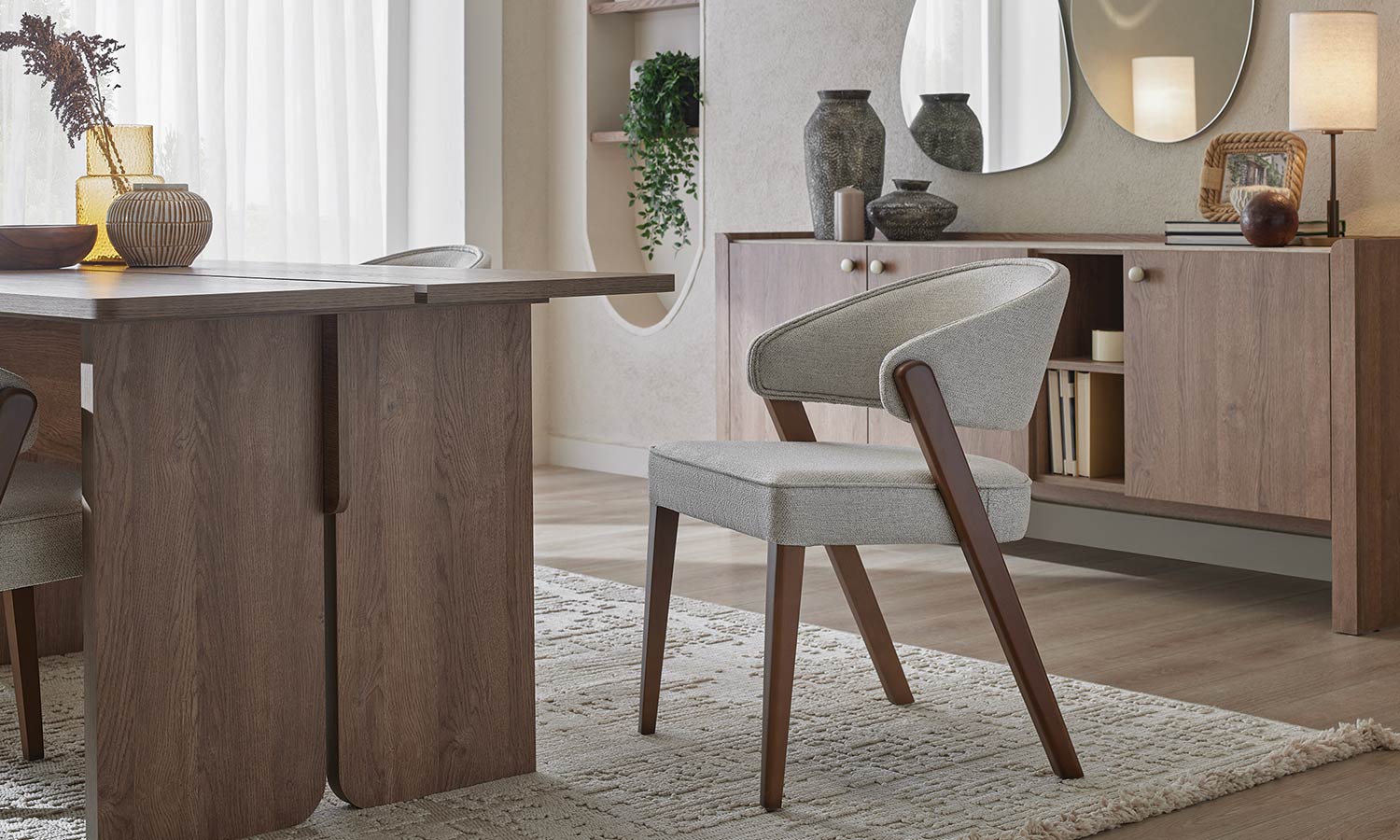 Doğallığın yalın bir çizgiyle buluştuğu Veneta Yemek Odası Takımı güçlü bir karakter ortaya koyuyor. Ceviz ve travertenin uyumu modern tasarımla harmanlanarak mekâna sade ama sıcak bir atmosfer kazandırıyor. Metalik vizon tonlarındaki kulplar ve güçlü ayak yapısı koleksiyonun modern duruşunu pekiştiriyor.